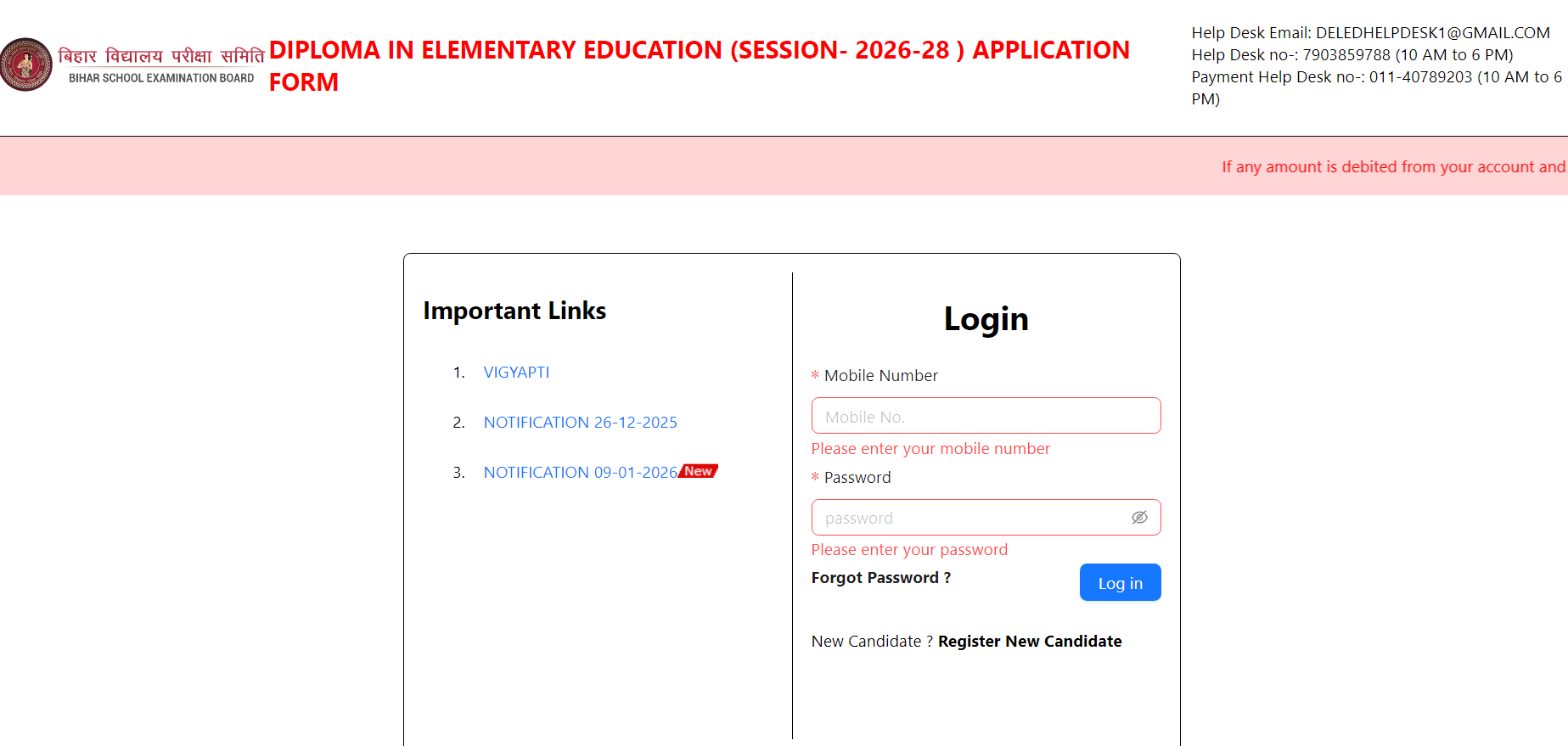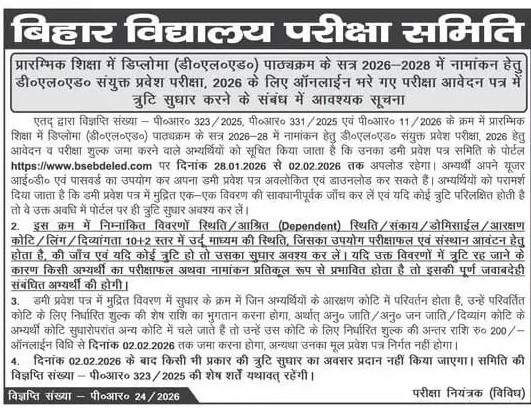 Bihar Deled (डिप्लोमा इन एलीमेंट्री एजुकेशन) प्रवेश परीक्षा के लिए ऑनलाइन आवेदन 11 दिसंबर 2025 से लेकर अंतिम तिथि 24 जनवरी 2026 तक स्वीकार की गई थी। अब इसका डमी एडमिट कार्ड 28 जनवरी 2026 को ऑफिसियल वेबसाइट के माध्यम से जारी किया जायेगा। अभियर्थी 05 फरवरी 2026 से लेकर अंतिम तिथि 10 फरवरी 2026 तक डमी एडमिट कार्ड डाउनलोड व् इसमें हुई त्रुटि सुधार कर सकते हैं।
