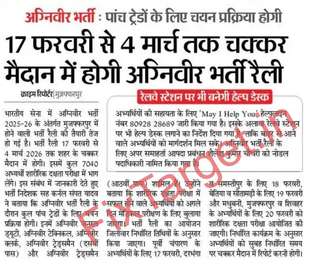 Indian Army Agniveer Rally Bharti 2026: भारतीय सेना में अगिनवीर भर्ती 2025-26 के अंतर्गत मुजफ्फरपुर में होने वाली रैली भर्ती का ऑफिसियल नोटिफिकेशन जारी कर दिया गया है। यह रैली भर्ती 17 फरवरी, 2026 से लेकर अंतिम तिथि 04 मार्च, 2026 तक चक्कर मैदान में आयोजित करवाई जायेगी। इस भर्ती में कुल 5 ट्रेडो के लिए चयन प्रकिया की जायेगी। अग्निवीर जनरल ड्यूटी, अग्निवीर टेक्निकल, अग्निवीर क्लर्क, अग्निवीर ट्रेड्समैन (दसवीं पास), अग्निवीर ट्रेड्समैन (आठवीं पास) शामिल हैं। इस भर्ती में कुल 7040 पद रखी गई हैं। Indian Army Agniveer Rally Bharti 2026 में दसवीं पास और आठवीं पास उम्मीदवार भाग ले सकते हैं।