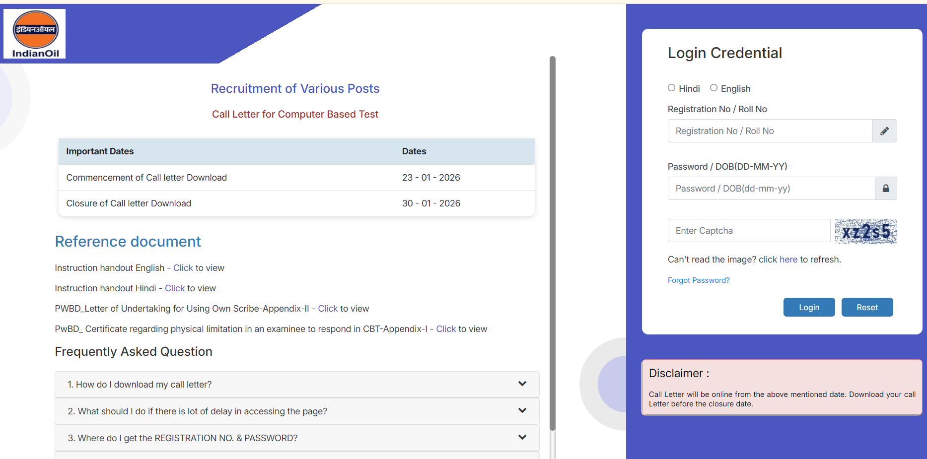Ans:– IOCL Non-Executive Admit Card इसके ऑफिसियल वेबसाइट https://iocl.com/ के माध्यम से डाउनलोड कर सकते हैं।
