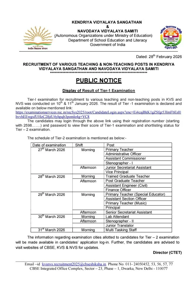 KVS And NVS Tier-II Exam Date 2026: केन्द्रीय विद्यालय संगठन (KVS) और नवोदय विद्यालय समिति (NVS) के द्वारा विभिन्न शिक्षण और गैर-शिक्षण के पदों पर भर्ती निकाली गई थी। जिसकी लिखित परीक्षा 10-11 जनवरी 2026 को आयोजित करवाई गई थी। जिसका रिजल्ट 28 फरवरी 2026 को ऑफिसियल वेबसाइट के माध्यम से जारी कर दिया गया हैं। अब इस भर्ती की टियर-2 की परीक्षा 27-31 मार्च 2026 को आयोजित करवाई जाएगी। जिसके लिए ऑफिसियल नोटिस जारी कर दिया गया हैं।