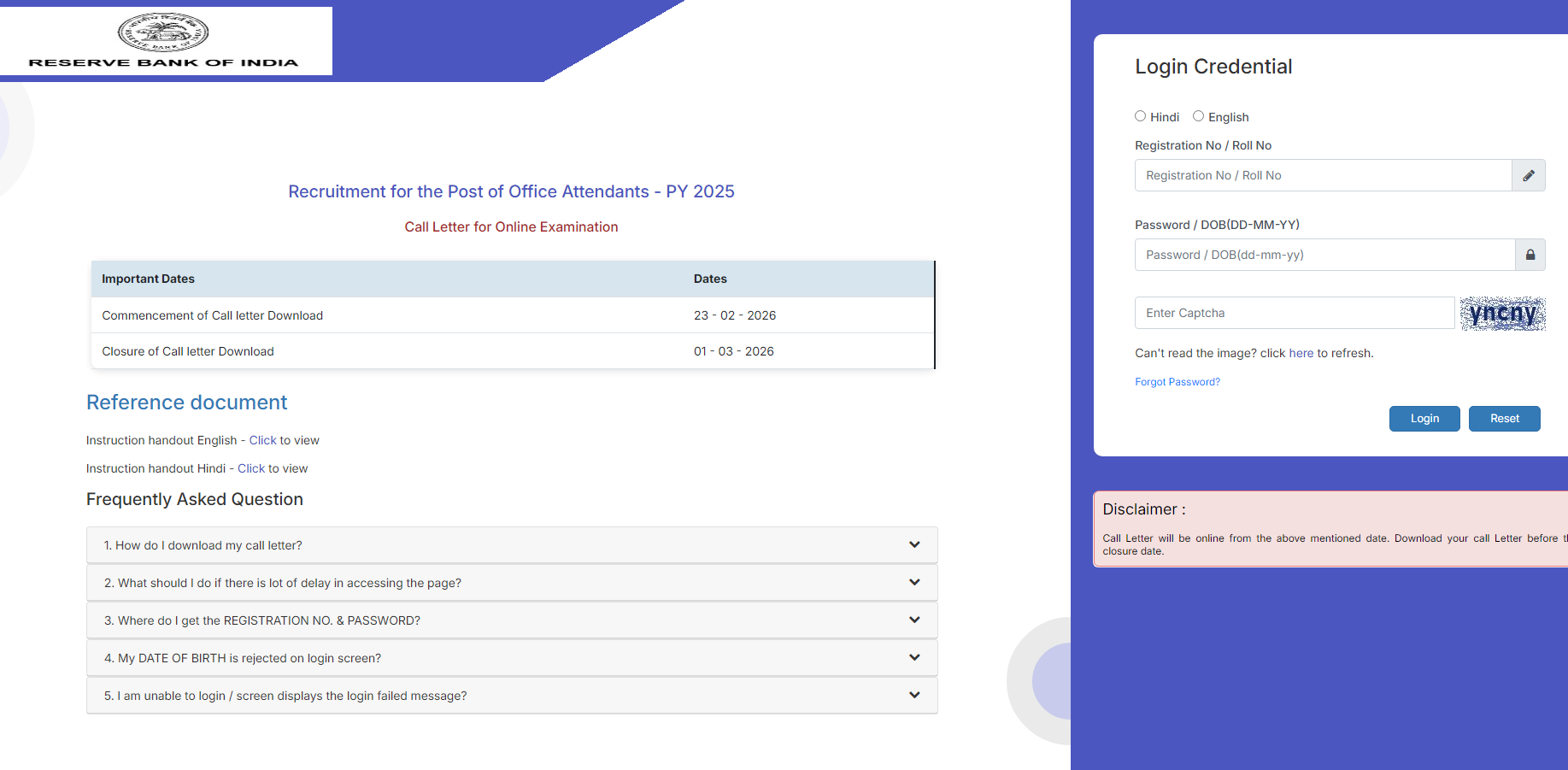 Ans:– आरबीआई ऑफिस अटेंडेंट का एडमिट कार्ड 23 फरवरी 2026 को ऑफिसियल वेबसाइट के माध्यम से जारी कर दिया गया हैं।