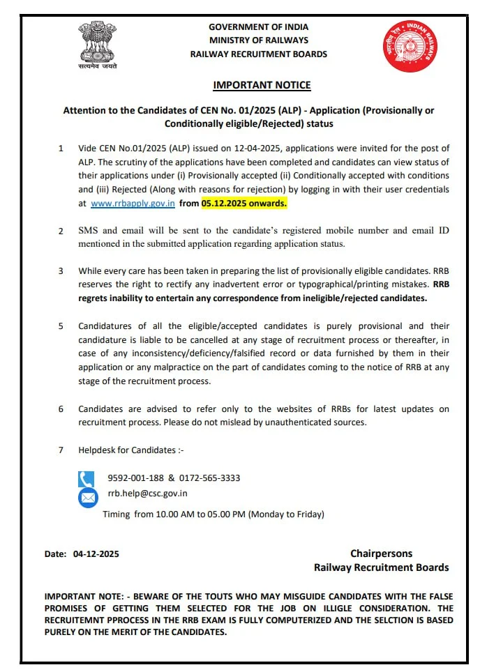 Ans:– रेलवे ALP भर्ती का एप्लीकेशन स्टेटस 05 दिसंबर 2025 को जारी किया जायेगा।