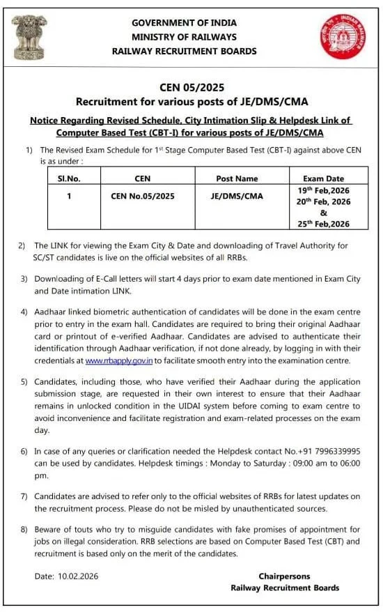RRB Junior Engineer JE Exam Date & Admit Card 2026 Notice