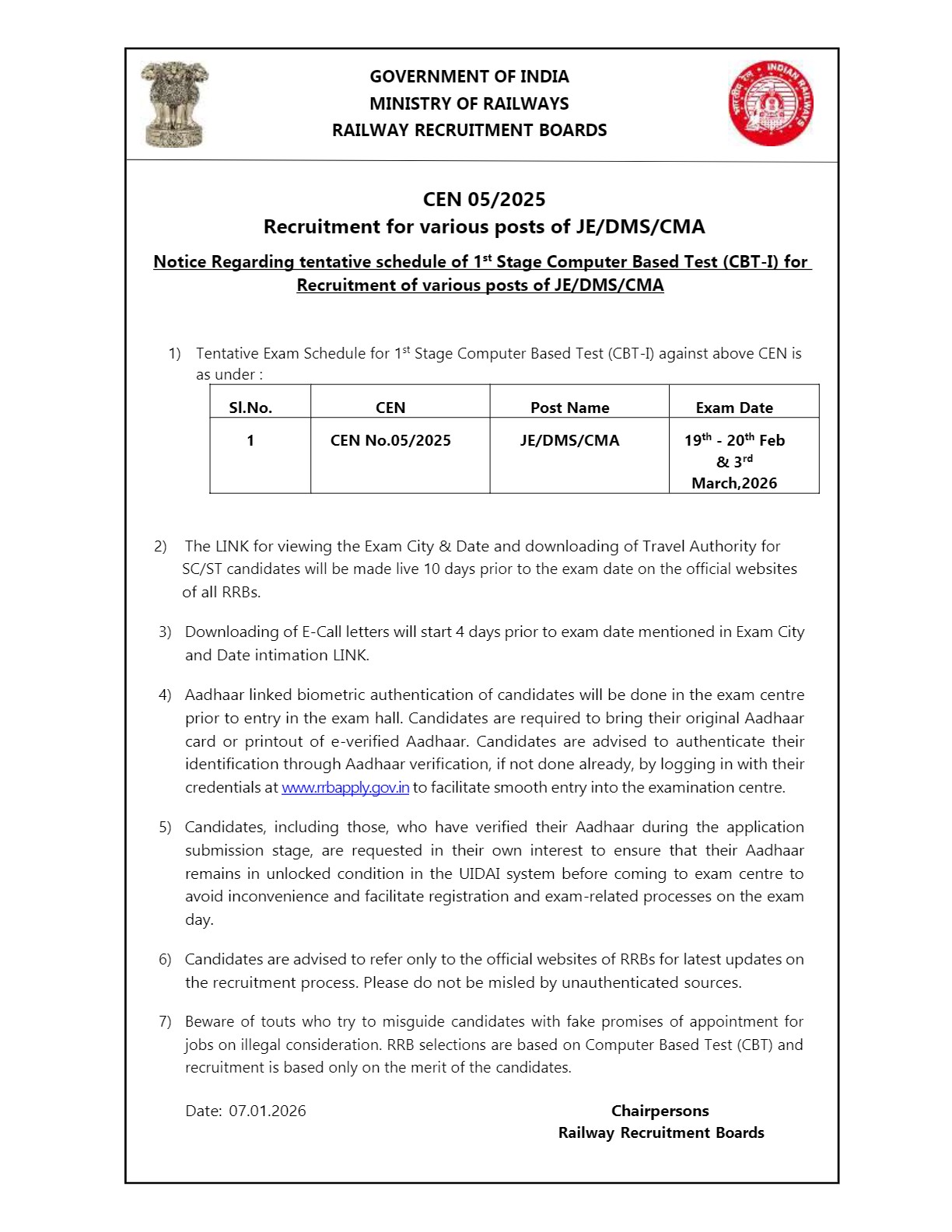 RRB Junior Engineer JE Exam Date 2025 Notice
