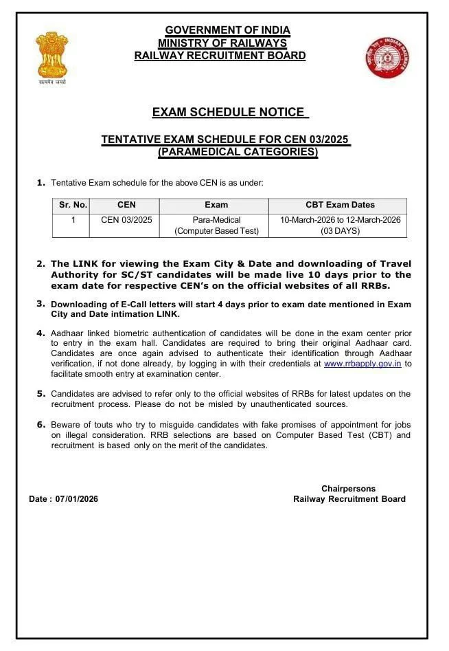 रेलवे पैरामेडिकल भर्ती की लिखित परीक्षा 10 से 12 मार्च 2026 तक आयोजित करवाई जाएगी। रेलवे पैरामेडिकल परीक्षा तिथि की ऑफिसियल नोटिस 7 जनवरी 2026 को रेलवे के ऑफिसियल वेबसाइट के माध्यम से जारी कर दिया गया है। इस परीक्षा में शामिल होने वाले सभी परीक्षार्थी नीचे दिए गए लिंक पर क्लिक करके परीक्षा तिथि की नोटिस डाउनलोड कर सकते हैं और इस परीक्षा से जुडी सभी जानकारी प्राप्त कर सकते हैं।